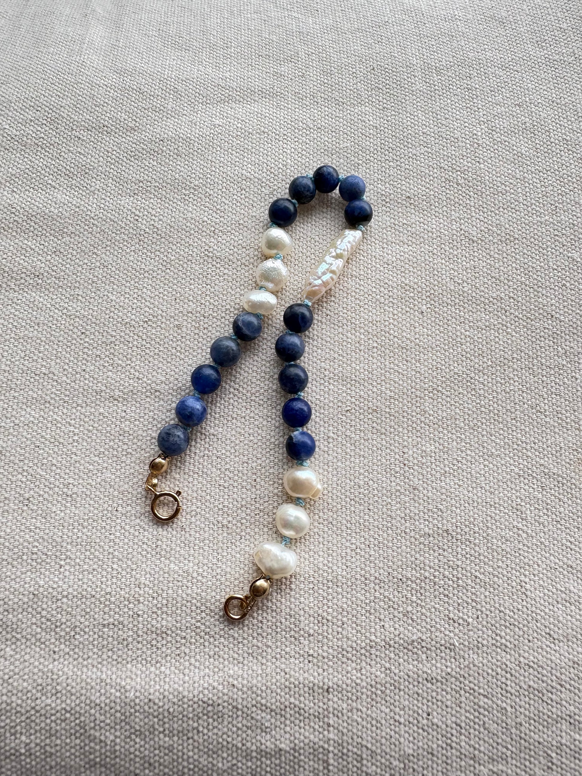 Made with gorgeous 4mm Blue Sodalite gemstone beads, freshwater and BIWA style pearls this bracelet is hand-knotted with baby-blue-nylon thread.